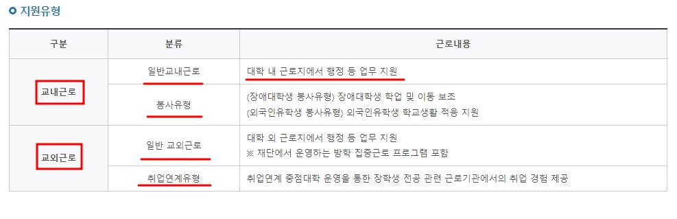 일반적으로 소속되어있는 학교 내에서 근로하는 교내 근로와 취업 연계와 관련된 교외근로로 나뉘게 되며 총 4가지로 세분화되어 볼 수 있습니다.