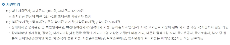 2024년 시급을 기점으로 교내근로는 시간당 최저시급인 9,860원이 적용되고 교외근로는 시간당 12,220원이 지원됩니다.