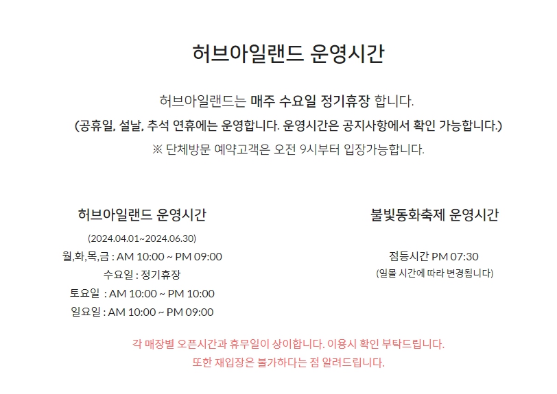 평일은 월, 화, 목, 금 아침 10시부터 저녁 9시까지이며, 토요일은 아침 10시부터 저녁 10시, 일요일은 아침 10시부터 저녁 9시까지입니다. 매주 수요일은 정기휴장이니 참고 바라며 불빛동화축제 운영시간은 해가 지는 시간에 따라 다르지만 저녁 7시 30분에 점등됩니다.