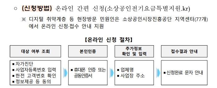 정부에서 제공하는 소상공인전기요금특별지원 홈페이지를 통해 온라인으로 간편하게 신청할 수 있습니다.