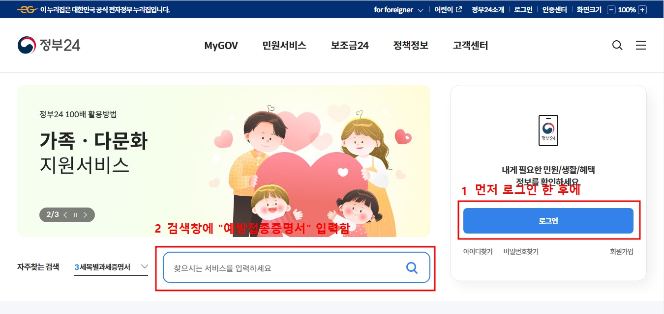 2. 로그인 후 통합검색창에 ‘예방접종증명’을 입력합니다.
