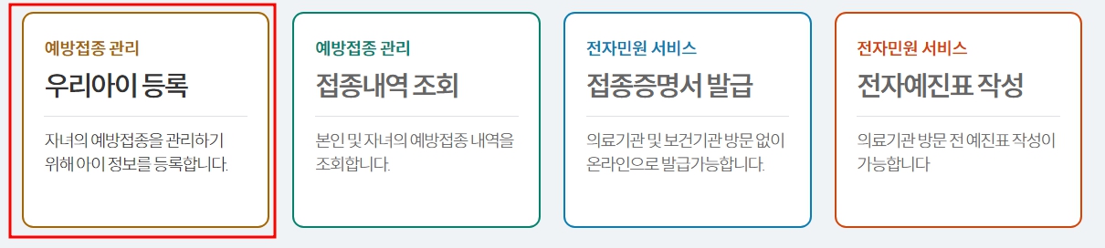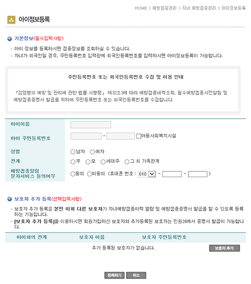 예방접종관리 → 자녀 예방접종 관리 → 아이정보등록