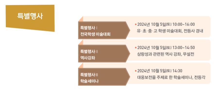 2024년 삼랑성역사문화축제는 10월 5일부터 10월 13일까지 진행됩니다. 이 기간 동안 다양한 프로그램이 마련되어 있어, 방문객들은 여러 가지 활동에 참여할 수 있습니다. 특히, 첫날인 10월 5일에는 '전국학생 미술대회'가 열리며, 이후에는 다양한 공연과 전시가 이어질 예정입니다. 매일 다른 테마의 프로그램이 진행되니, 미리 일정을 확인하고 방문하는 것이 좋습니다.